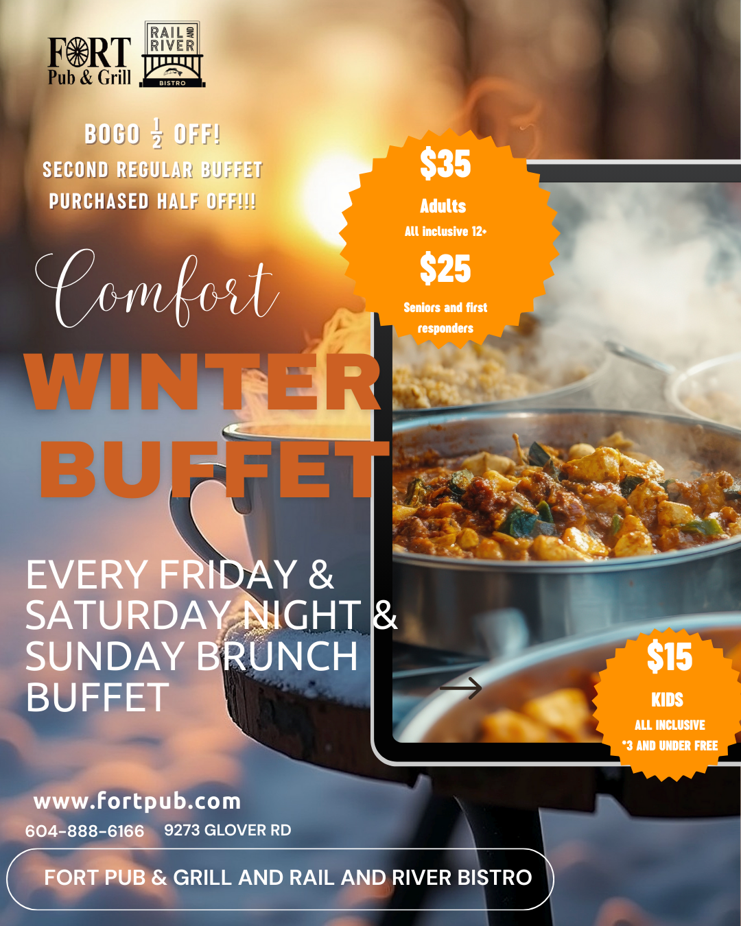 Sign up for our Newsletter (complete with offers and upcoming event details) and get entered into our MONTHLY DRAW of "Dinner for 2" at The Fort Pub or Rail & River Bistro!